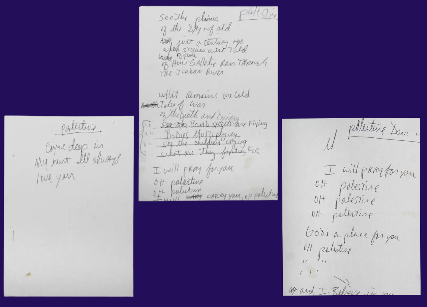 “Palestine, Don’t Cry” — handwritten lyrics on British Airways Concorde stationery: Julien’s Auctions (2010). Michael Jackson Handwritten Lyrics — “Palestine.” https://www.juliensauctions.com/en/items/45115/michael-jackson-handwritten-lyrics