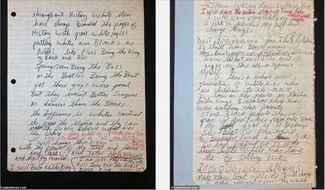 Jackson’s private notes from the 1980s — reflections on racial hierarchy in music: True Michael Jackson (2021). “Origin of the Title King of Pop.” Includes images of Jackson’s 1987 handwritten notes and affirmations to himself about racial inequality in the music industry. https://www.truemichaeljackson.com/art/king-of-pop/