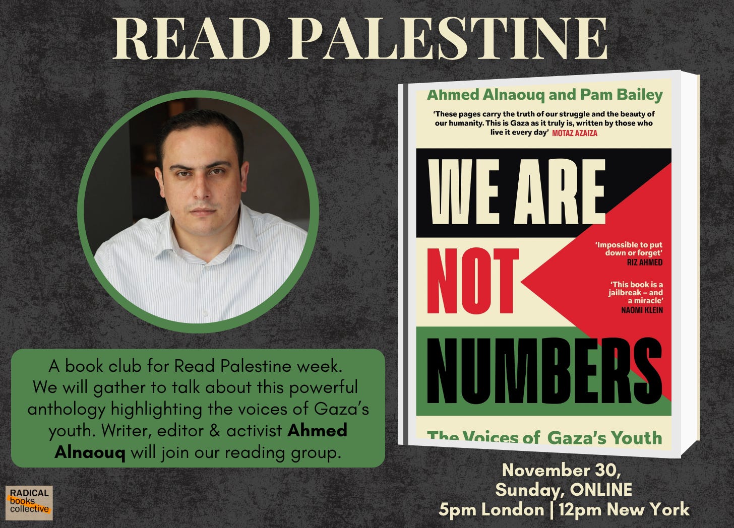 This book club is part of Read Palestine Week organized by the Publishers for Palestine. These are seven days when people around the world read – publicly and in community – as part of the global resistance to the genocide of the Palestinian people. To this end, publishers, librarians, & booksellers will share free reads, host events, and recommend books. This year, we will have a particular focus on raising funds to support Palestinian writers in Gaza.