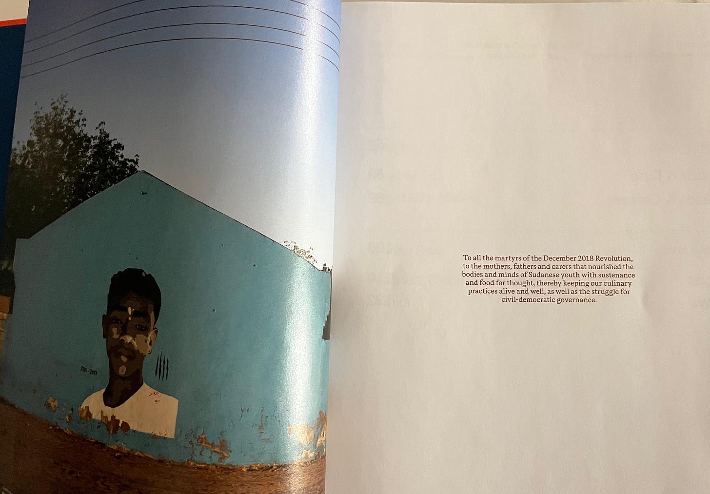 The Sudanese Kitchen opens with a photograph of a mural memorializing a young martyr and the following page carries a dedication to all the martyrs of the December 2018 revolution and to the family members who “nourished the bodies and minds of Sudanese youth.” Right away, Omer grounds his book in the connected nature of revolution, liberation and Sudanese practices of food and sustenance.