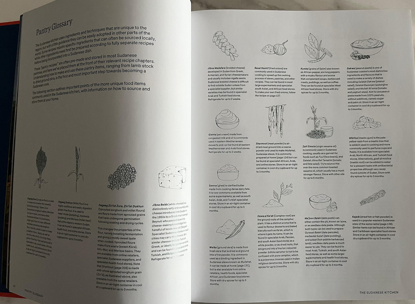As the book progresses, vivid color photographs of landscapes, foods and markets are interspersed with infographics and lists. There is a timeline of key events in Sudanese culinary history that outline the important moments of agricultural history as well as a map of its current agricultural landscape. There is an inventory which lists all the main ingredients used in Sudanese cuisine as well as an illustrated glossary for pantry items, cooking utensils, Sudanese terminology and even some proverbs.