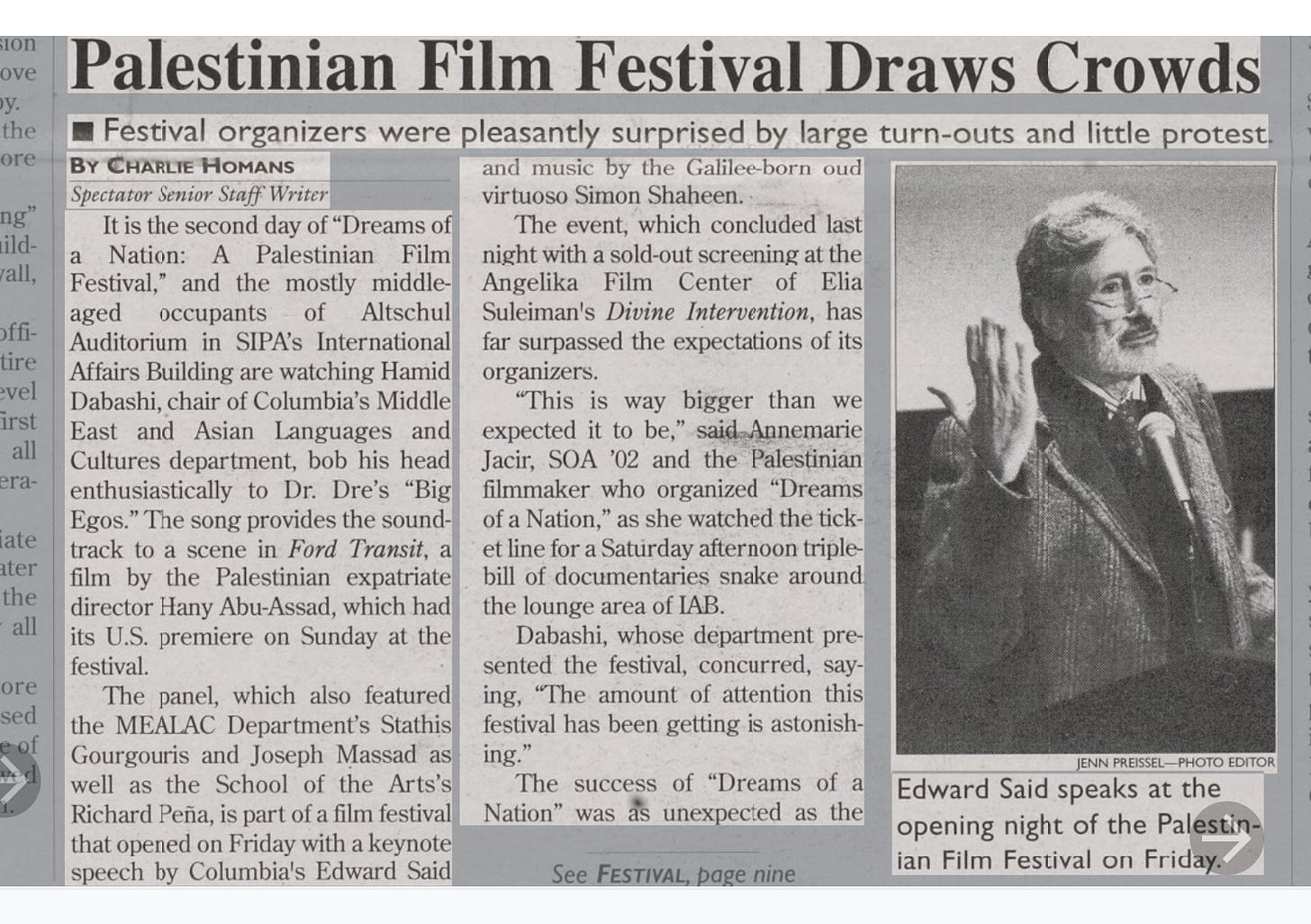 Palestinian cinema has a long and prestigious history, and one that I was introduced to as a young grad student in New York City in 2003. I had attended “Dreams of a Nation: A Palestinian Film Festival” organized at Columbia University, and the opening night featured a keynote address by none other than the incredible Edward Said. The festival, whether deliberately or not, was responding to a particularly fraught post-9/11 moment that was marked by the vilification of Muslims, rampant censorship and the loud calls for wars in Iraq and Afghanistan. Sound familiar?
