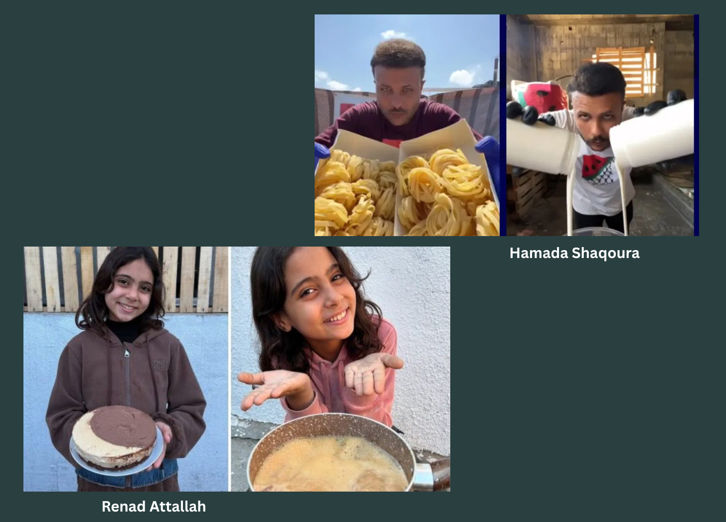 Food bloggers have become popular over the course of the two-year genocide, and many use these platforms to raise funds for their families. Renad Atallah was only 9 years old when she gained a large following after making cooking videos, smiling radiantly even as bombs rained down and ingredients became more and more scarce. Similarly Hamada Shaqoura began posting videos of himself cooking and distributing food to children. His videos have a tongue-in-cheek humor as he glowers at the camera while stirring vats of food. His humorous affect alongside images of large quantities of food work against the stereotypes of wretchedness and emaciation.
